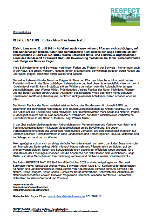 Danke, dass du die Natur respektierst. Die Natur ist Freizeit- und Lebensraum zugleich. Hier fühlen wir uns wohl, hier können wir entspannen, geniessen. Doch ob beim Sport oder auf Ausflügen: Wir teilen die Natur mit Pflanzen und Tieren. Je weniger wir deren Lebensräume stören, desto besser.
